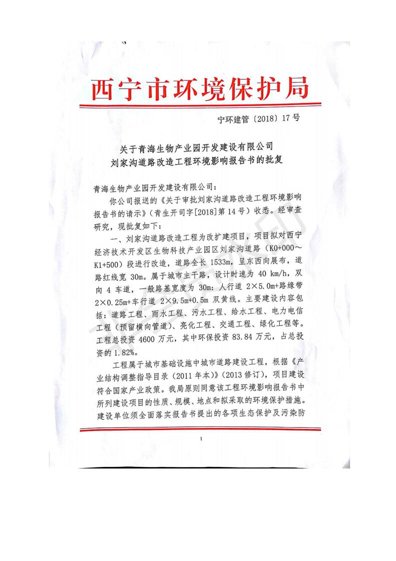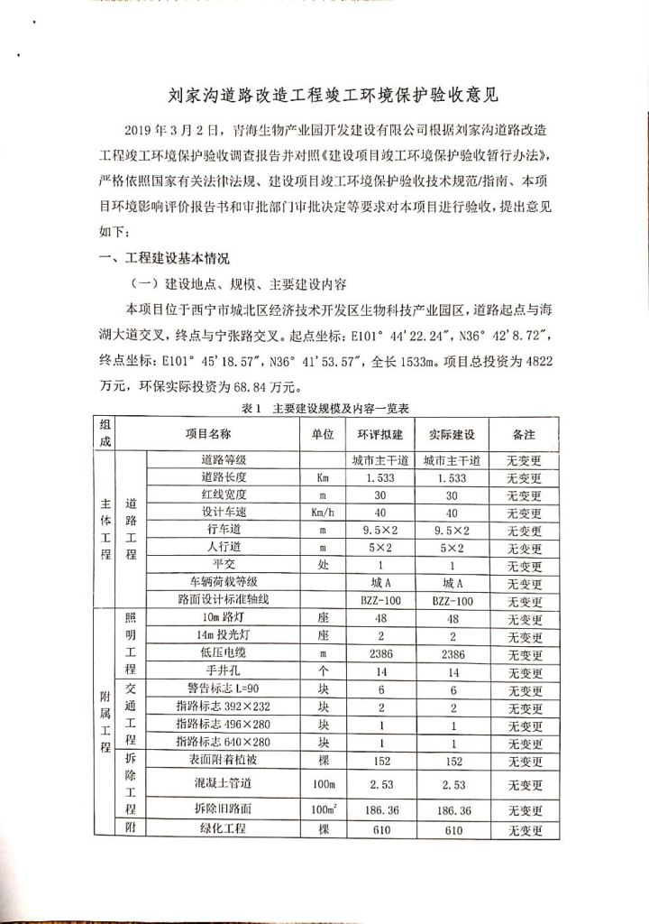 根據(jù)中華人民共和國務(wù)院令第682號《國務(wù)院關(guān)于修改〈建設(shè)項目環(huán)境保護管理條例〉的決定》和《建設(shè)項目竣工環(huán)境保護驗收暫行辦法》(國務(wù)院令682號),劉家溝道路改造工程竣工環(huán)境保護驗收內(nèi)容(包括竣工環(huán)境保護驗收調(diào)查報告和驗收意見)公示如下: 一、項目名稱:劉家溝道路改造工程 二、地點:青海省西寧市城北區(qū)生物園區(qū) 三、建設(shè)單位:生物產(chǎn)業(yè)園開發(fā)建設(shè)有限公司 四、建設(shè)內(nèi)容:劉家溝道路經(jīng)改造后全長1533m,道路呈東西向展布,道路紅線為30m。設(shè)計時速為40km/h,雙向4車道。 五、公示時間:二〇一九年三月十四日至二〇一九年四月十一日 六、聯(lián)系人:張工 公示期間,對上述公示內(nèi)容如有異議,請以書面形式反饋,個人須署真實姓名,單位須加蓋公章。