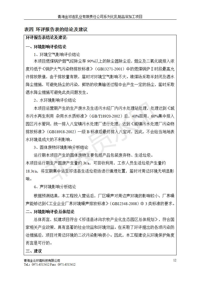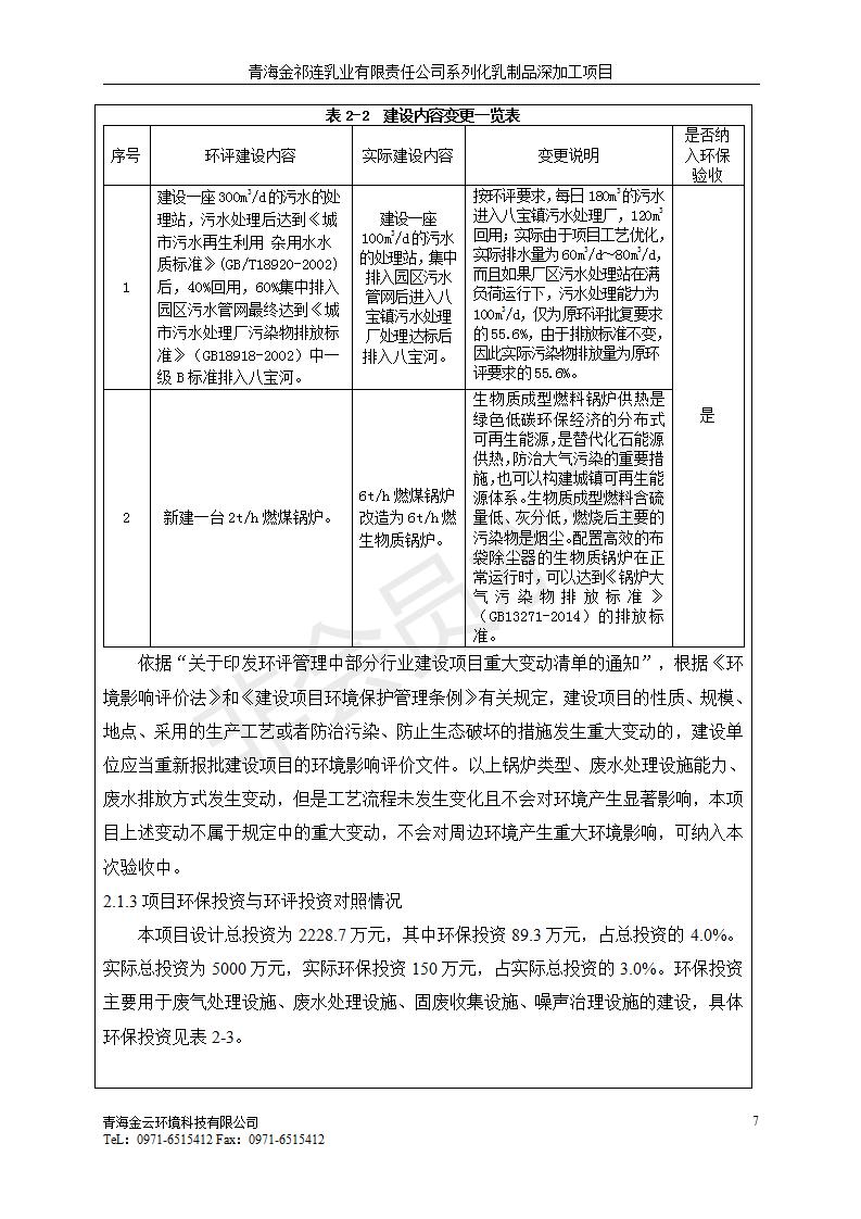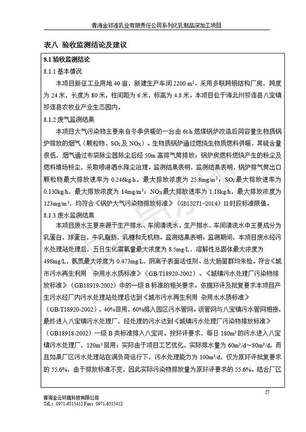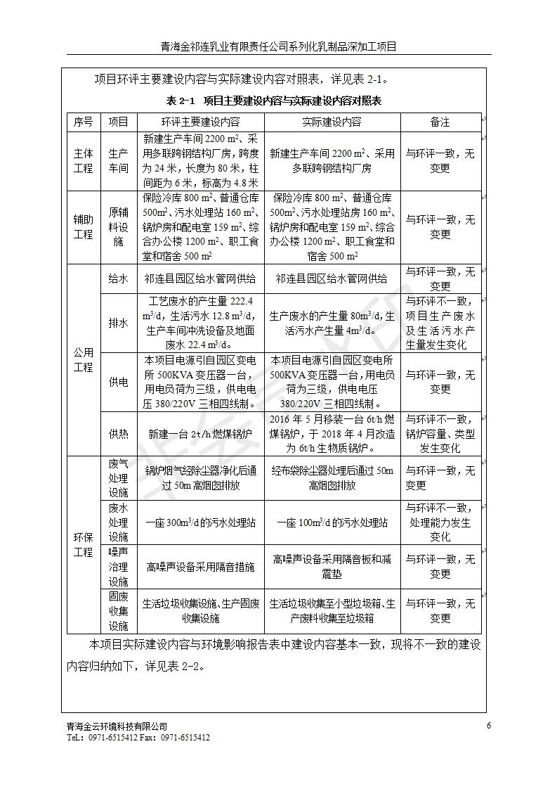 根據(jù)中華人民共和國國務院令第682號《國務院關于修改〈建設項目環(huán)境保護管理條例〉的決定》和《建設項目竣工環(huán)境保護驗收暫行辦法》(國務院令682號),青海金祁連乳業(yè)有限責任公司系列化乳制品深加工項目(包括竣工環(huán)境保護驗收監(jiān)測報告表和驗收意見)公示如下。 一、項目名稱:青海金祁連乳業(yè)有限責任公司系列化乳制品深加工項目 二、地點:海北藏族自治州祁連縣冰溝農(nóng)牧產(chǎn)業(yè)化生態(tài)園區(qū) 三、建設單位:青海金祁連乳業(yè)有限責任公司 四、建設內(nèi)容:本項目新征工業(yè)用地40畝,新建生產(chǎn)車間2200 m2、采用多聯(lián)跨鋼結構廠房,跨度為24米,長度為80米,柱間距為6米,標高為4.8米。廠房內(nèi)部根據(jù)產(chǎn)品生產(chǎn)工藝及工序要求分為不同的工作區(qū)域和車間辦公室。建設有保鮮冷庫800 m2、普通倉庫500m2、污水處理站房160 m2、鍋爐房和配電室159 m2、綜合辦公樓1200 m2、職工食堂和宿舍500 m2、其他輔助用房35 m2、蓄水池100 m2以及與土建工程相關聯(lián)的水、電、熱官網(wǎng)等輔助設施。 五、聯(lián)系人:張工 六、聯(lián)系電 話:0971-6515411 七、公示時間:二〇一九年七月十日至二〇一九年八月六日 公示期間,對上述公示內(nèi)容如有異議,請以書面形式反饋,個人須署真實姓名,單位須加蓋公章。