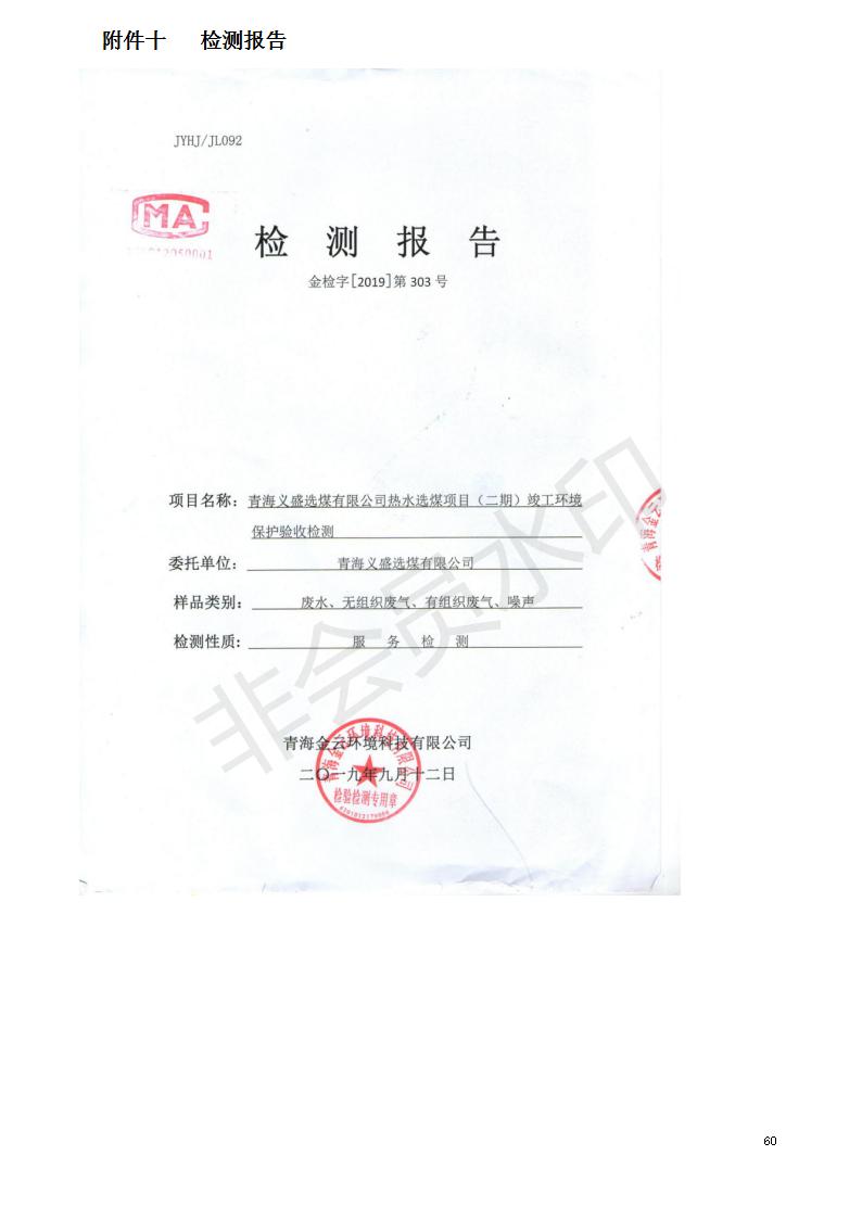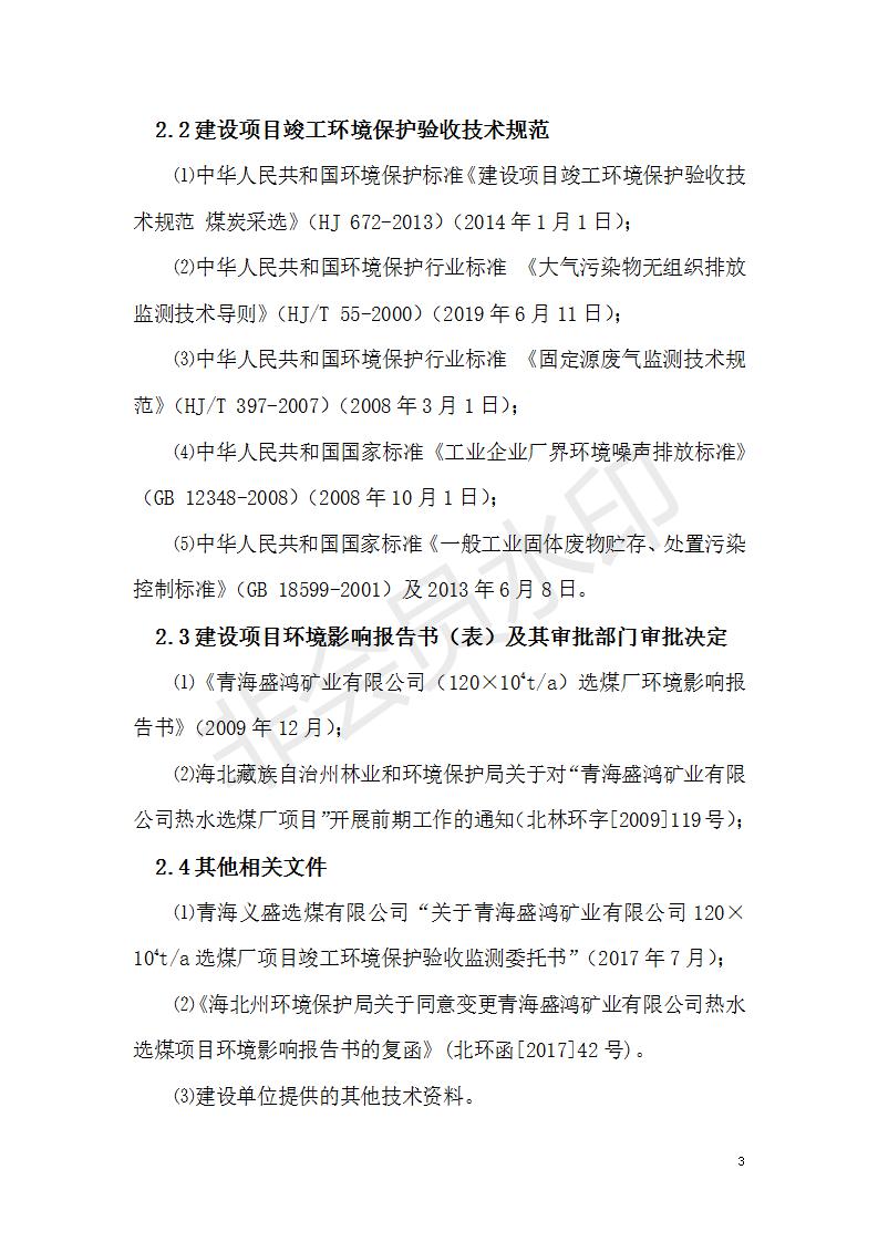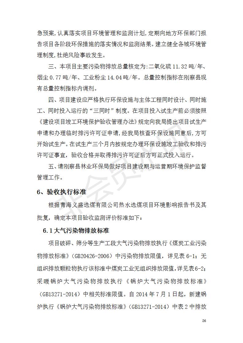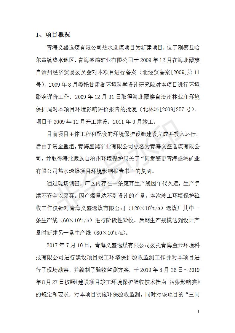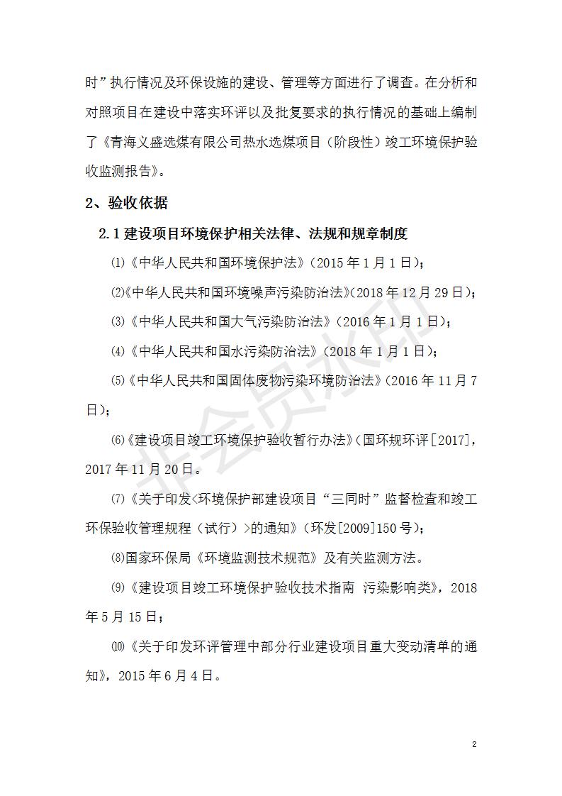 根據(jù)中華人民共和國國務(wù)院令第682號《國務(wù)院關(guān)于修改〈建設(shè)項目環(huán)境保護(hù)管理條例〉的決定》和《建設(shè)項目竣工環(huán)境保護(hù)驗收暫行辦法》(國務(wù)院令682號),青海義盛選煤有限公司熱水選煤項目(階段性)竣工環(huán)境保護(hù)驗收監(jiān)測報告(包括竣工環(huán)境保護(hù)驗收監(jiān)測報告和驗收意見)公示如下。 一、項目名稱:青海義盛選煤有限公司熱水選煤項目(階段性) 二、地點:剛察縣熱水鎮(zhèn) 此外還包括公用工程系統(tǒng)、消防系統(tǒng)及輔助生產(chǎn)設(shè)施等。 五、聯(lián)系人:張工六、聯(lián)系電話:0971-6515411 七、公示時間:二〇一九年十一月十二日至二〇一九年十二月九日