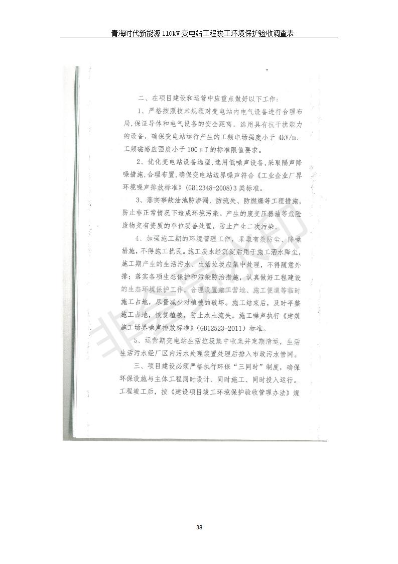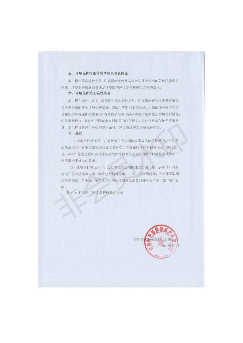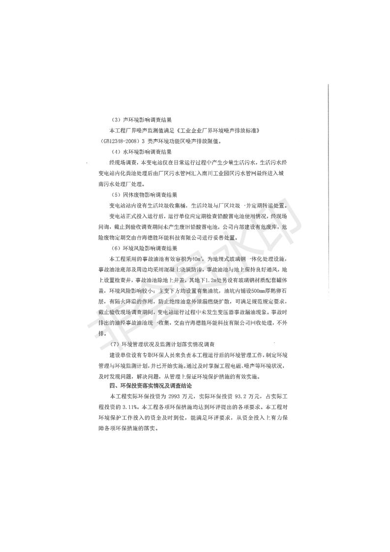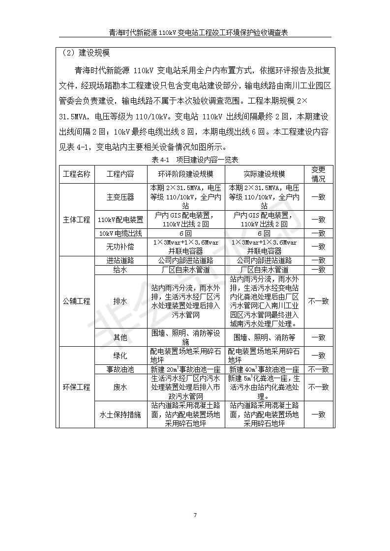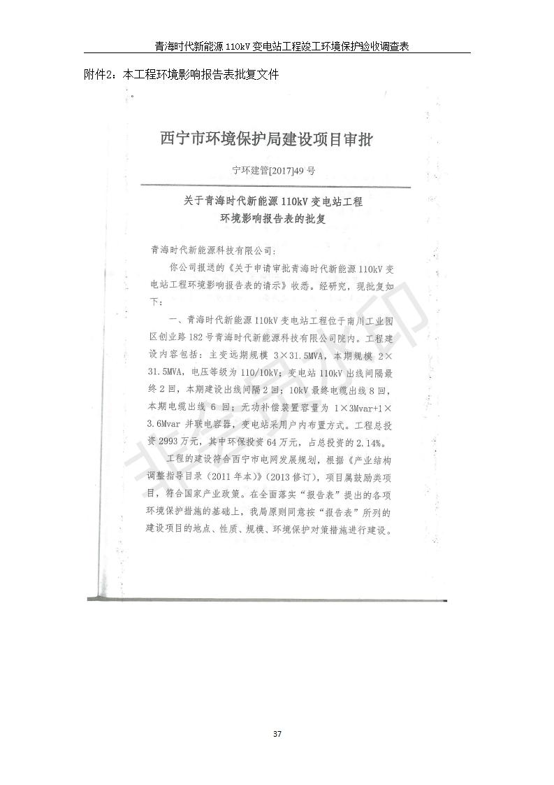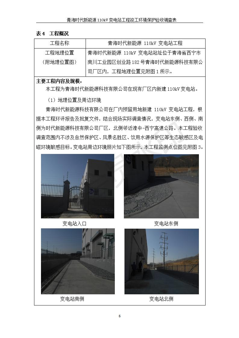 根據(jù)中華人民共和國國務(wù)院令第682號《國務(wù)院關(guān)于修改〈建設(shè)項目環(huán)境保護管理條例〉的決定》和《建設(shè)項目竣工環(huán)境保護驗收暫行辦法》(國務(wù)院令682號),青海時代新能源110kV變電站工程(包括竣工環(huán)境保護驗收調(diào)查表和驗收意見)公示如下。 一、項目名稱:青海時代新能源110kV變電站工程 二、地點:青海省西寧市南川工業(yè)園區(qū)創(chuàng)業(yè)路182號青海時代新能源科技有限公司廠區(qū)內(nèi) 三、建設(shè)單位:青海時代新能源科技有限公司 四、建設(shè)內(nèi)容:青海時代新能源 110kV 變電站采用全戶內(nèi)布置方式,依據(jù)環(huán)評報告及批復(fù)文件,經(jīng)現(xiàn)場踏勘本工程建設(shè)只包含變電站建設(shè)部分,輸電線路由南川工業(yè)園區(qū)管委會負責(zé)建設(shè),輸電線路不屬于本次驗收調(diào)查范圍。工程本期規(guī)模2×31.5MVA,電壓等級為110/10kV。變電站 110kV 出線間隔最終2回,本期建設(shè)出線間隔2回;10kV最終電纜出線8回,本期電纜出線6回。 五、聯(lián)系人:張工 六、聯(lián)系電話:0971-6515411 七、公示時間:二〇二〇年一月十四日至二〇二〇年二月十三日 公示期間,對上述公示內(nèi)容如有異議,請以書面形式反饋,個人須署真實姓名,單位須加蓋公章。