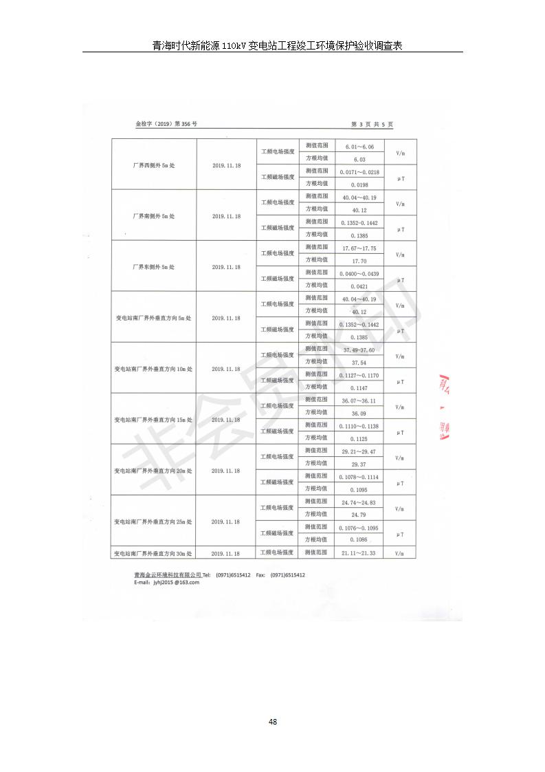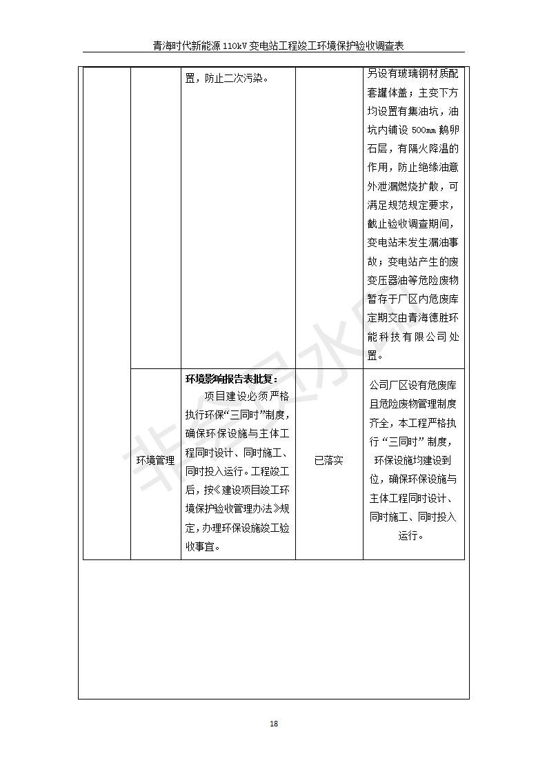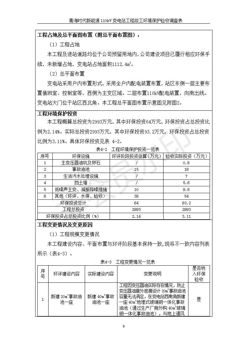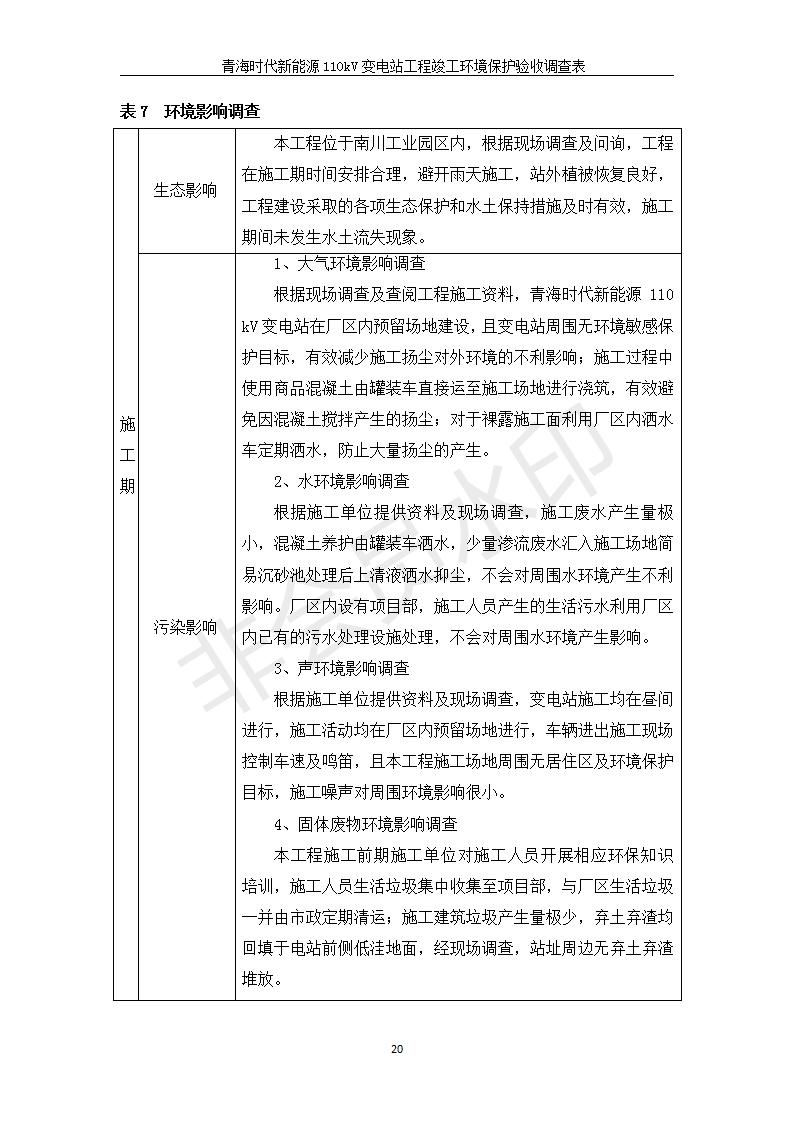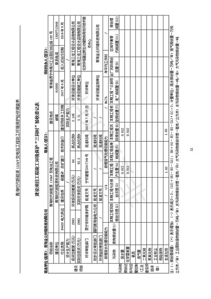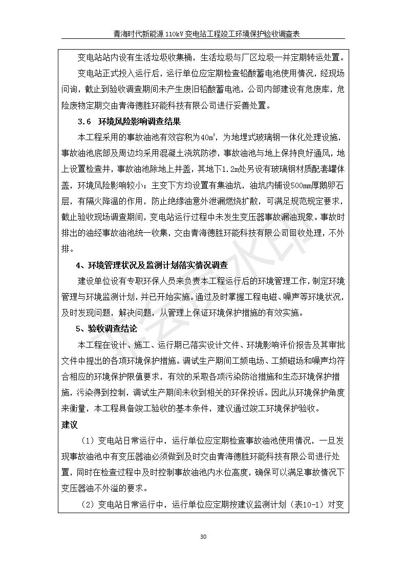 根據(jù)中華人民共和國國務(wù)院令第682號《國務(wù)院關(guān)于修改〈建設(shè)項目環(huán)境保護管理條例〉的決定》和《建設(shè)項目竣工環(huán)境保護驗收暫行辦法》(國務(wù)院令682號),青海時代新能源110kV變電站工程(包括竣工環(huán)境保護驗收調(diào)查表和驗收意見)公示如下。 一、項目名稱:青海時代新能源110kV變電站工程 二、地點:青海省西寧市南川工業(yè)園區(qū)創(chuàng)業(yè)路182號青海時代新能源科技有限公司廠區(qū)內(nèi) 三、建設(shè)單位:青海時代新能源科技有限公司 四、建設(shè)內(nèi)容:青海時代新能源 110kV 變電站采用全戶內(nèi)布置方式,依據(jù)環(huán)評報告及批復(fù)文件,經(jīng)現(xiàn)場踏勘本工程建設(shè)只包含變電站建設(shè)部分,輸電線路由南川工業(yè)園區(qū)管委會負責(zé)建設(shè),輸電線路不屬于本次驗收調(diào)查范圍。工程本期規(guī)模2×31.5MVA,電壓等級為110/10kV。變電站 110kV 出線間隔最終2回,本期建設(shè)出線間隔2回;10kV最終電纜出線8回,本期電纜出線6回。 五、聯(lián)系人:張工 六、聯(lián)系電話:0971-6515411 七、公示時間:二〇二〇年一月十四日至二〇二〇年二月十三日 公示期間,對上述公示內(nèi)容如有異議,請以書面形式反饋,個人須署真實姓名,單位須加蓋公章。