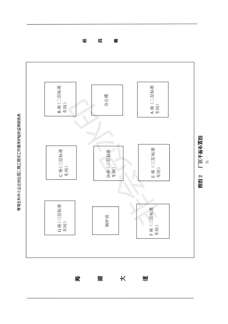 四、建設(shè)內(nèi)容:本項(xiàng)目為原有一期的基礎(chǔ)上擴(kuò)建本項(xiàng)目為生科創(chuàng)業(yè)園二期,總建筑面積65490m2,項(xiàng)目標(biāo)準(zhǔn)車間49000m2、辦公樓3190m2、倉儲5000m2、公共服務(wù)中心8100m2,輔助工程有配電室、鍋爐房200m2、其他配套設(shè)施道路地坪12001m2、綠化7415m2。