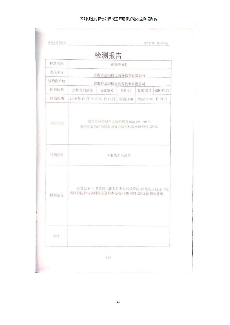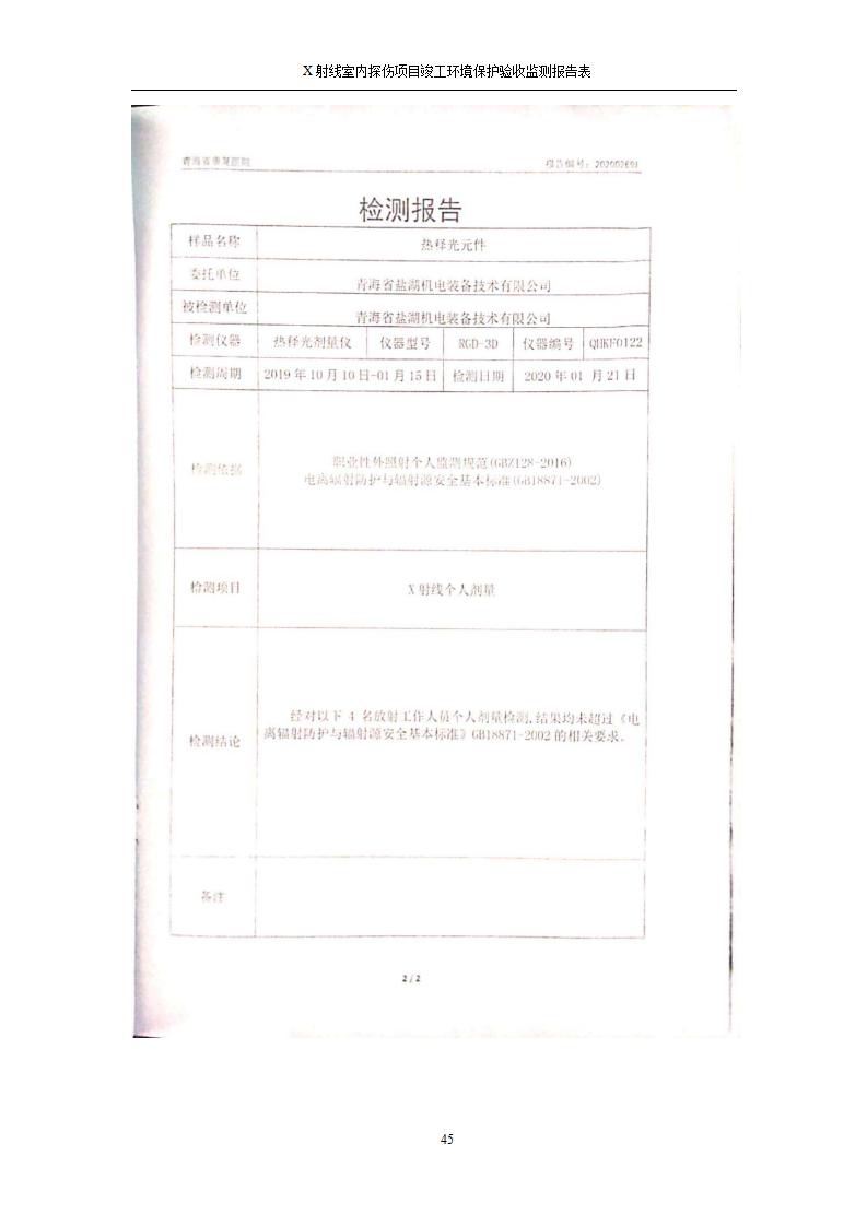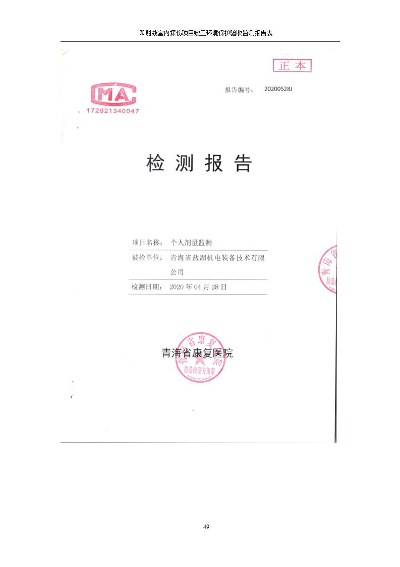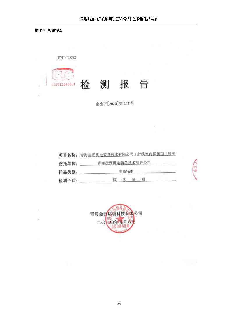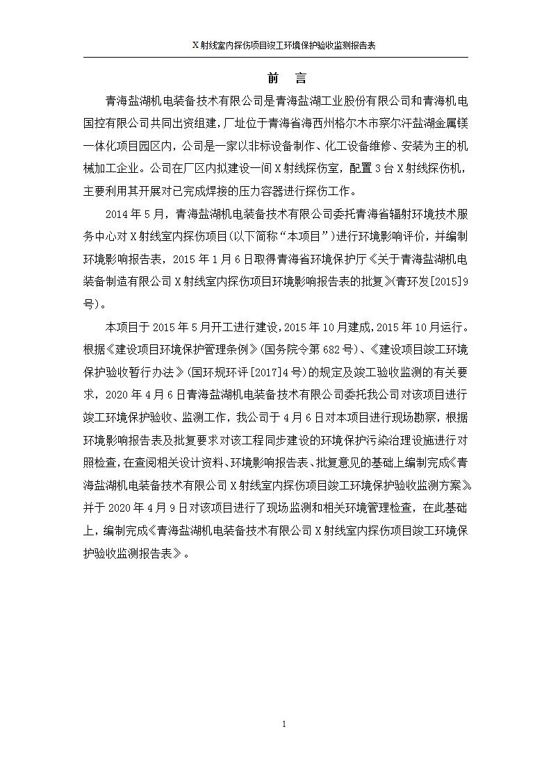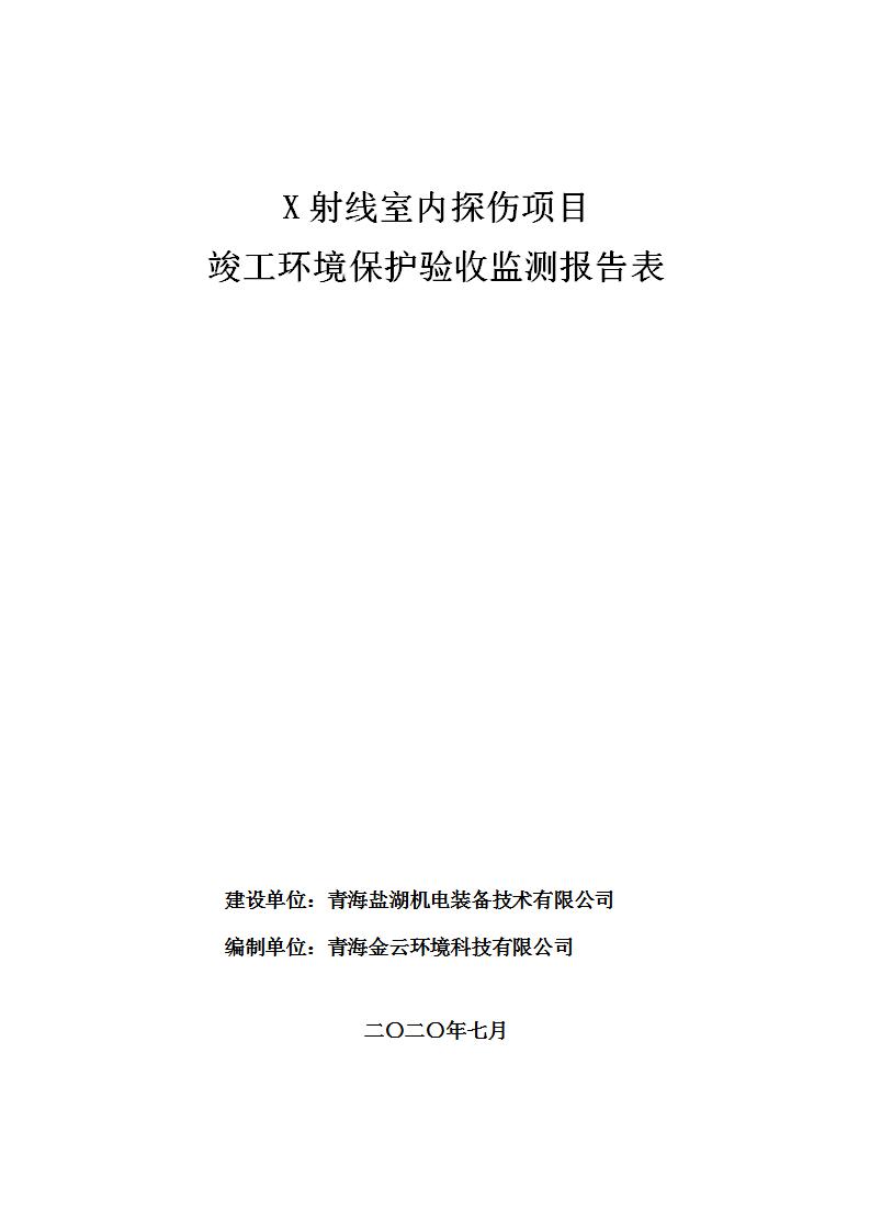 青海鹽湖機(jī)電裝備技術(shù)有限公司X射線室內(nèi)探傷項(xiàng)目竣工環(huán)境保護(hù)驗(yàn)收監(jiān)測(cè)報(bào)告表公示發(fā)布日期:(2020-7-10) 點(diǎn)擊次數(shù):3286 |