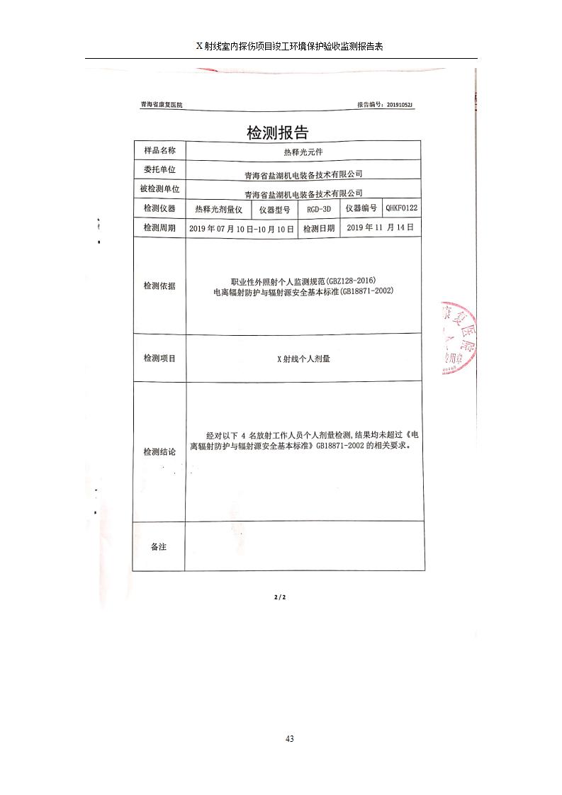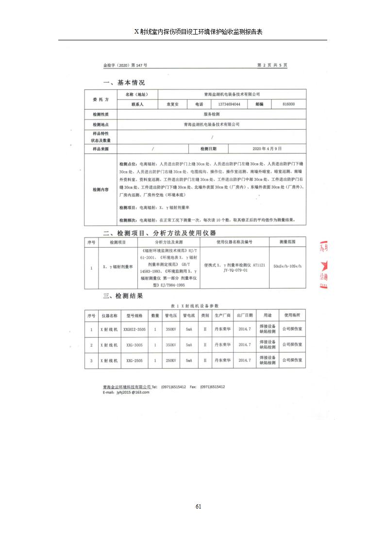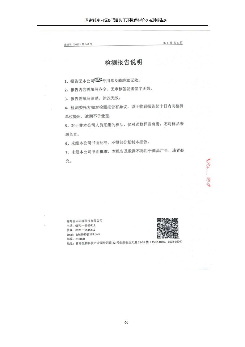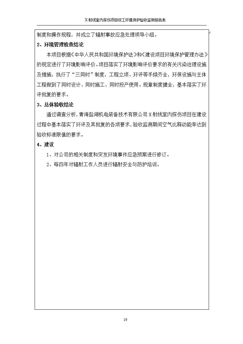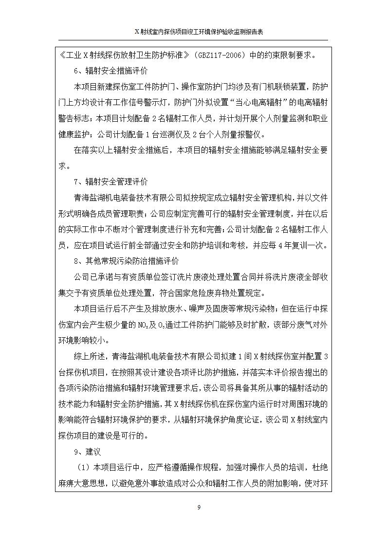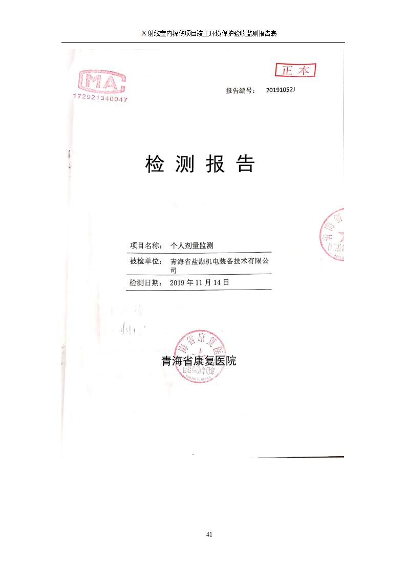 青海鹽湖機(jī)電裝備技術(shù)有限公司X射線室內(nèi)探傷項(xiàng)目竣工環(huán)境保護(hù)驗(yàn)收監(jiān)測(cè)報(bào)告表公示發(fā)布日期:(2020-7-10) 點(diǎn)擊次數(shù):3286 |