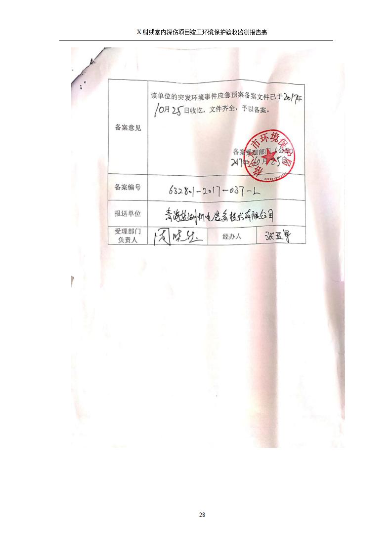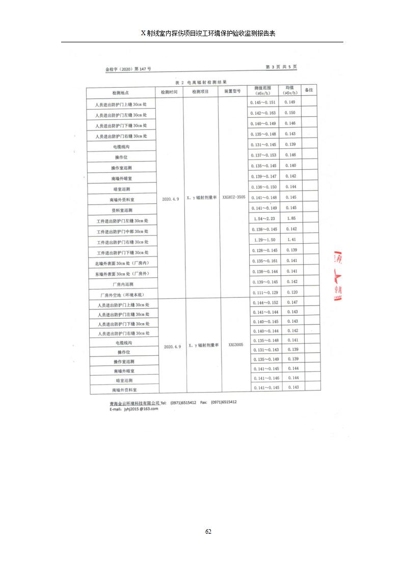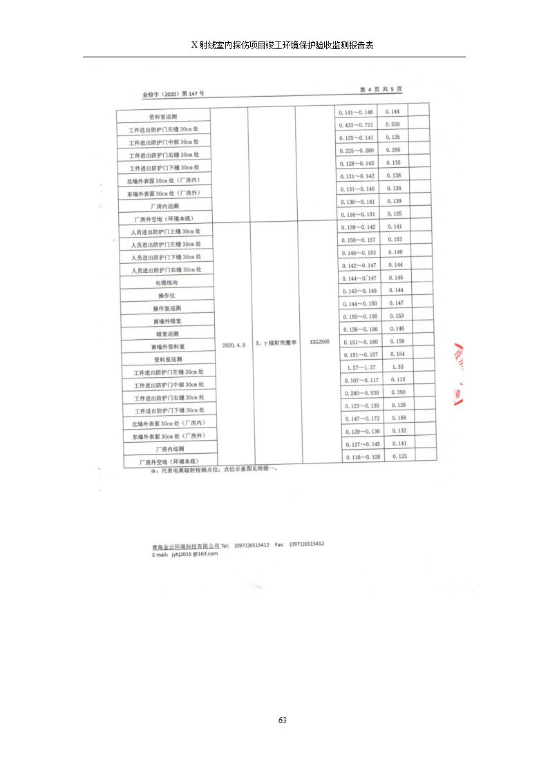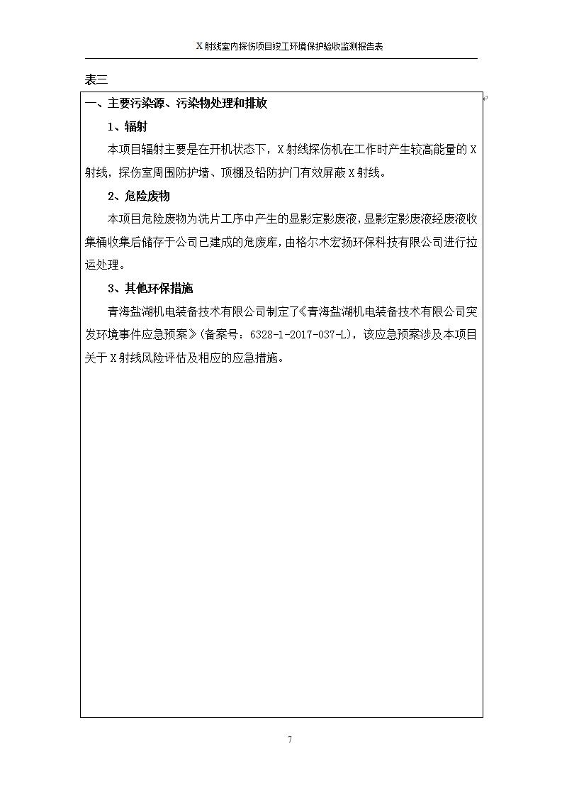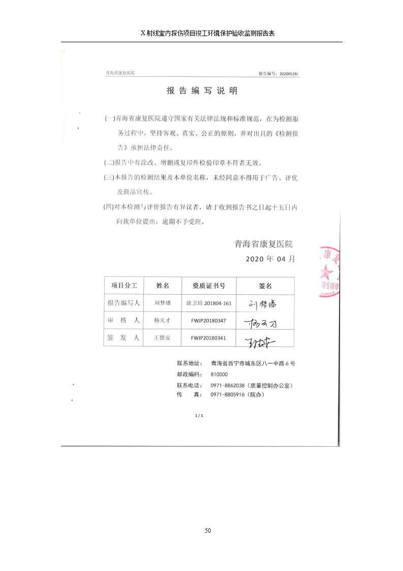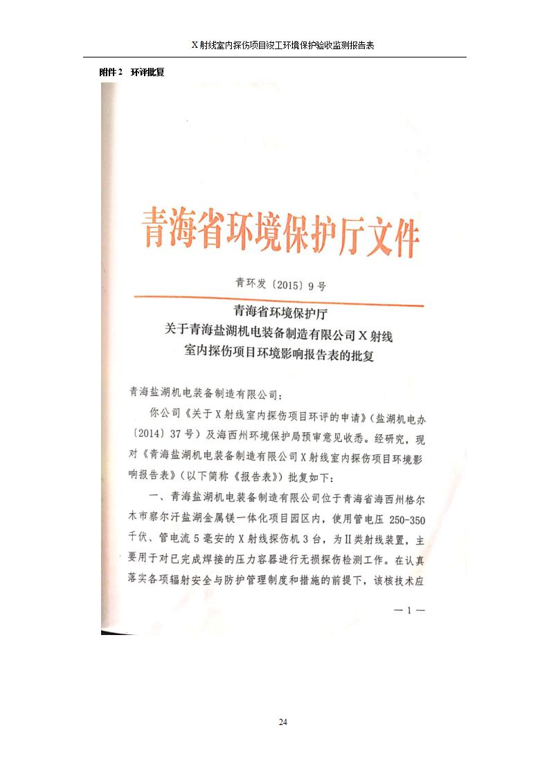 青海鹽湖機(jī)電裝備技術(shù)有限公司X射線室內(nèi)探傷項(xiàng)目竣工環(huán)境保護(hù)驗(yàn)收監(jiān)測(cè)報(bào)告表公示發(fā)布日期:(2020-7-10) 點(diǎn)擊次數(shù):3286 |