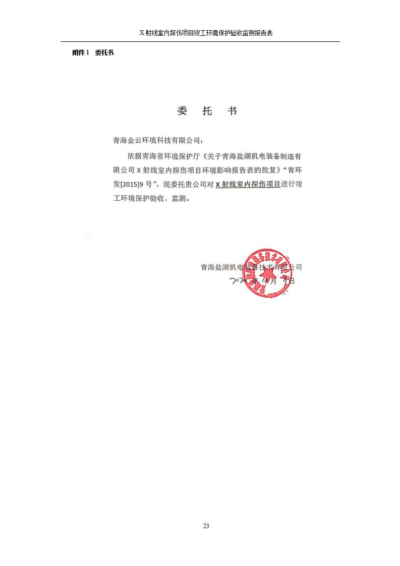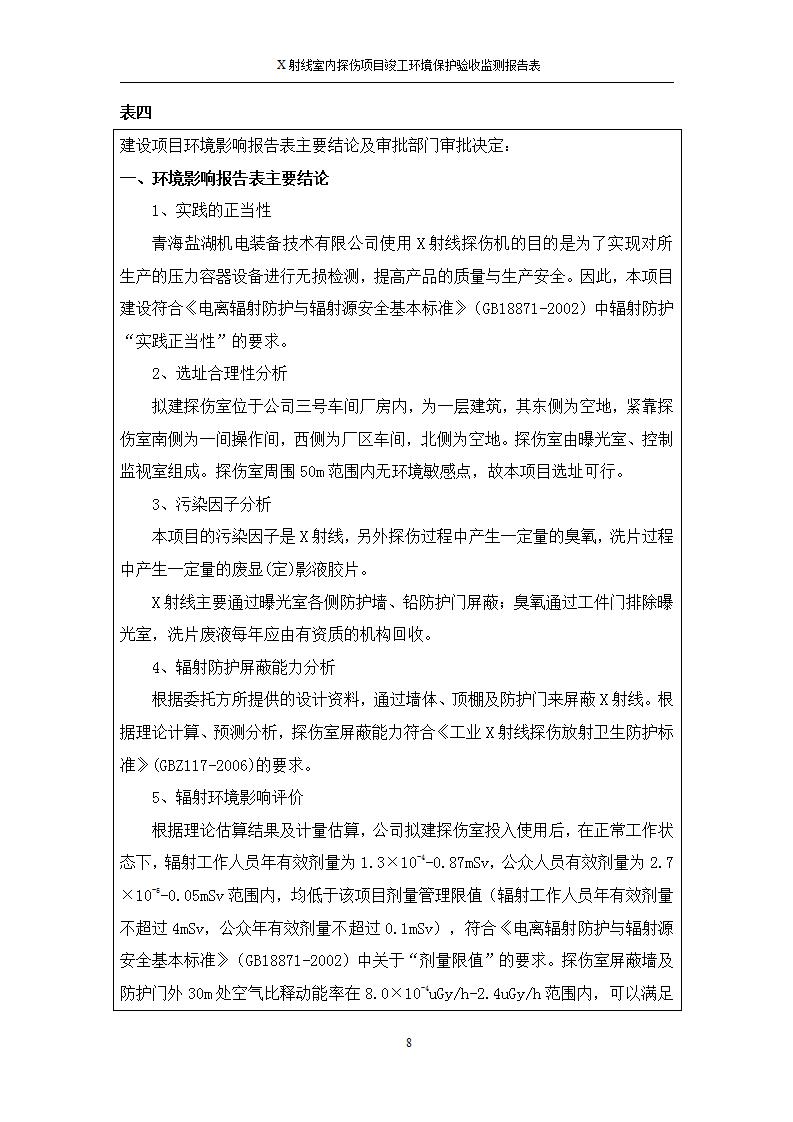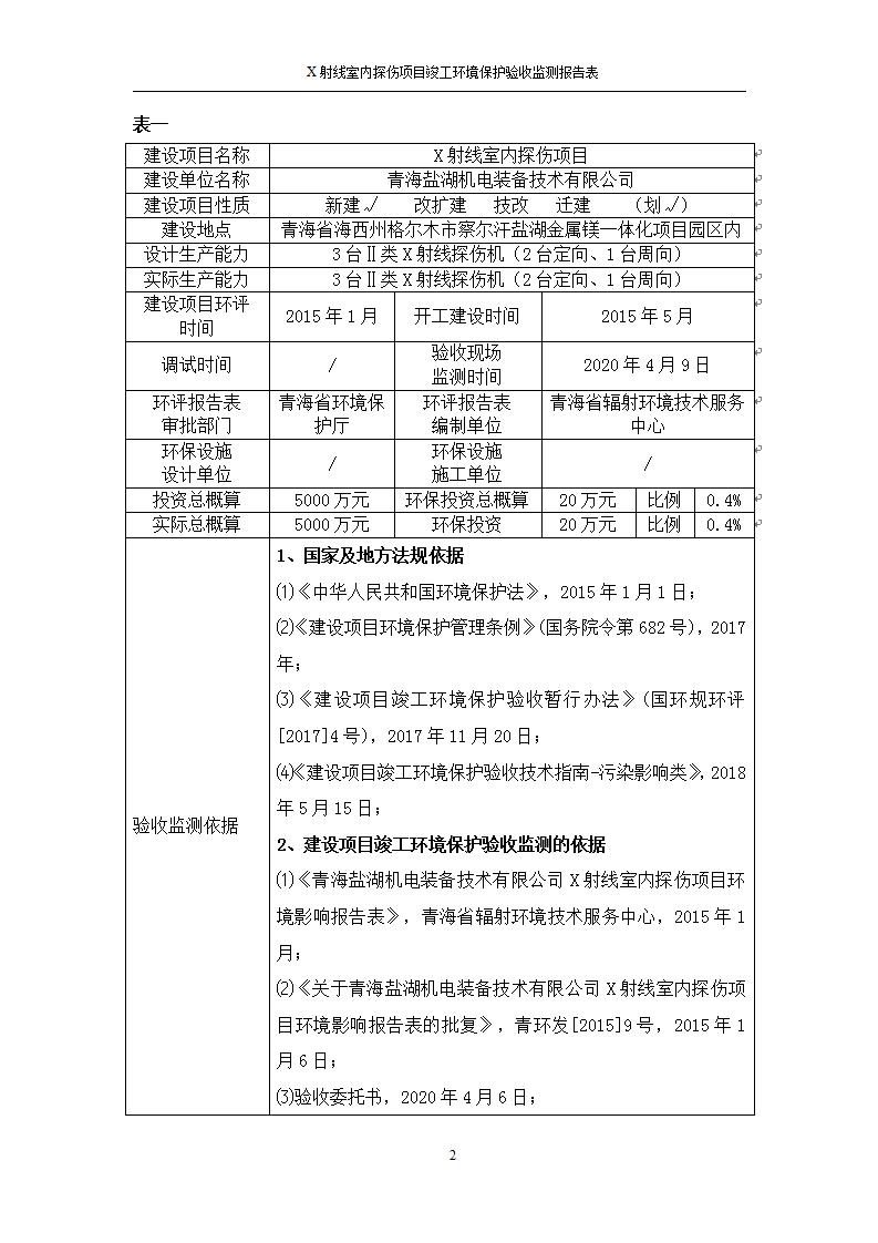 根據(jù)中華人民共和國國務(wù)院令第682號(hào)《國務(wù)院關(guān)于修改〈建設(shè)項(xiàng)目環(huán)境保護(hù)管理?xiàng)l例〉的決定》和《建設(shè)項(xiàng)目竣工環(huán)境保護(hù)驗(yàn)收暫行辦法》(國務(wù)院令682號(hào)),青海鹽湖機(jī)電裝備技術(shù)有限公司X射線室內(nèi)探傷項(xiàng)目竣工環(huán)境保護(hù)驗(yàn)收監(jiān)測(cè)報(bào)告表公示如下。 一、項(xiàng)目名稱:X射線室內(nèi)探傷項(xiàng)目竣工環(huán)境保護(hù)驗(yàn)收監(jiān)測(cè)報(bào)告表 二、地點(diǎn):青海省海西州格爾木市察爾汗鹽湖金屬鎂一體化項(xiàng)目園區(qū)內(nèi) 三、建設(shè)單位:青海鹽湖機(jī)電裝備技術(shù)有限公司 四、建設(shè)內(nèi)容:本項(xiàng)目位于公司三號(hào)車間廠房?jī)?nèi),探傷室長(zhǎng)21m,寬9.3m,共有3臺(tái)X射線探傷機(jī)。 五、聯(lián)系人:楊工 六、聯(lián)系電 話:0971-6515411 七、公示時(shí)間:二〇二〇年七月十日至二〇二〇年八月六日 公示期間,對(duì)上述公示內(nèi)容如有異議,請(qǐng)以書面形式反饋,個(gè)人須署真實(shí)姓名,單位須加蓋公章。